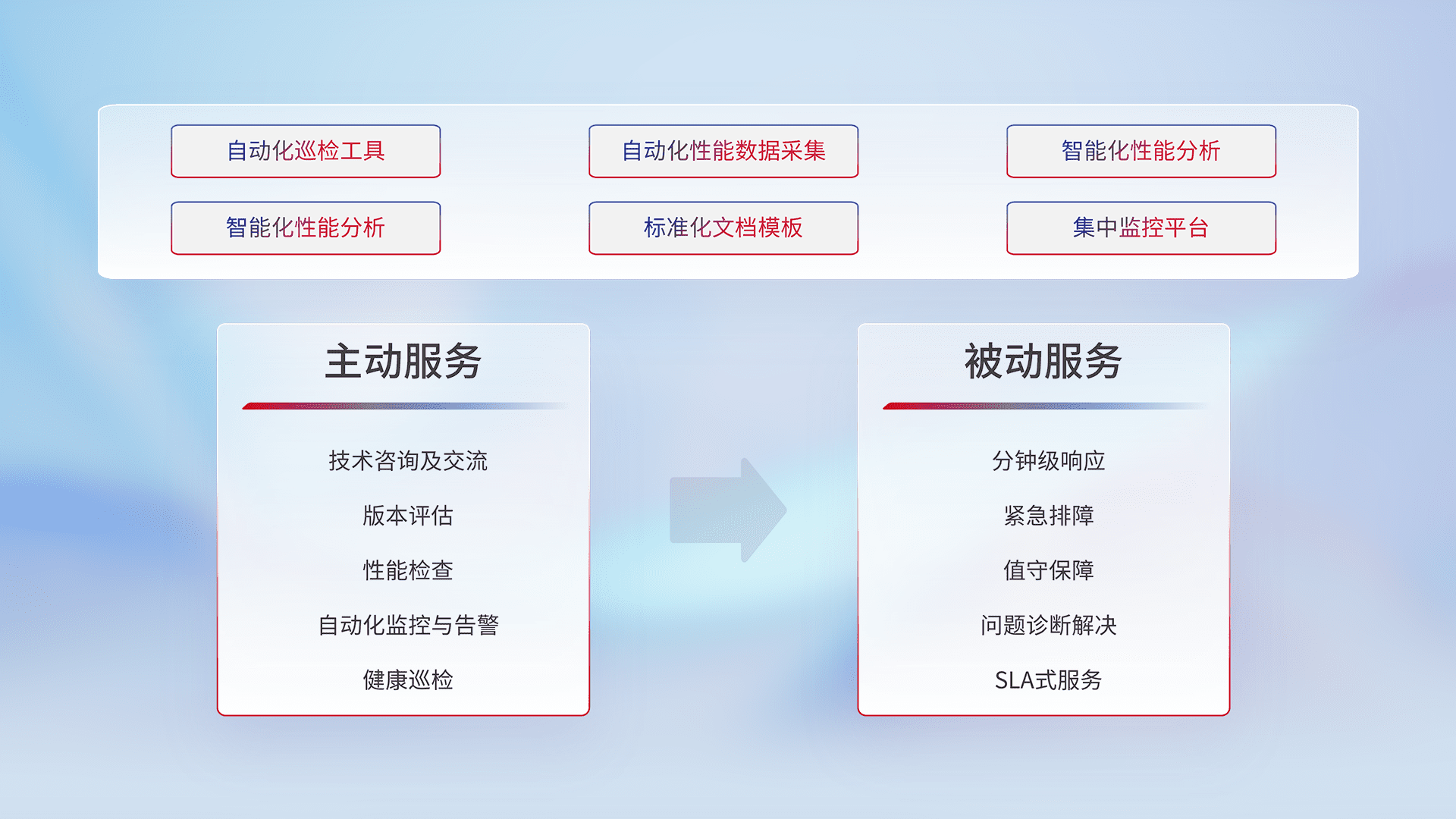 智能化工具和标准化文档,,,,保障服务质量,,,,提供主动服务(包含技术咨询、、、版本评估、、、、性能检查、、、自动化监控与告警、、、、健康巡检)和被动服务包含(分钟级响应、、、紧急排障、、、、值守保障、、问题诊断解决、、SLA服务)。。。。