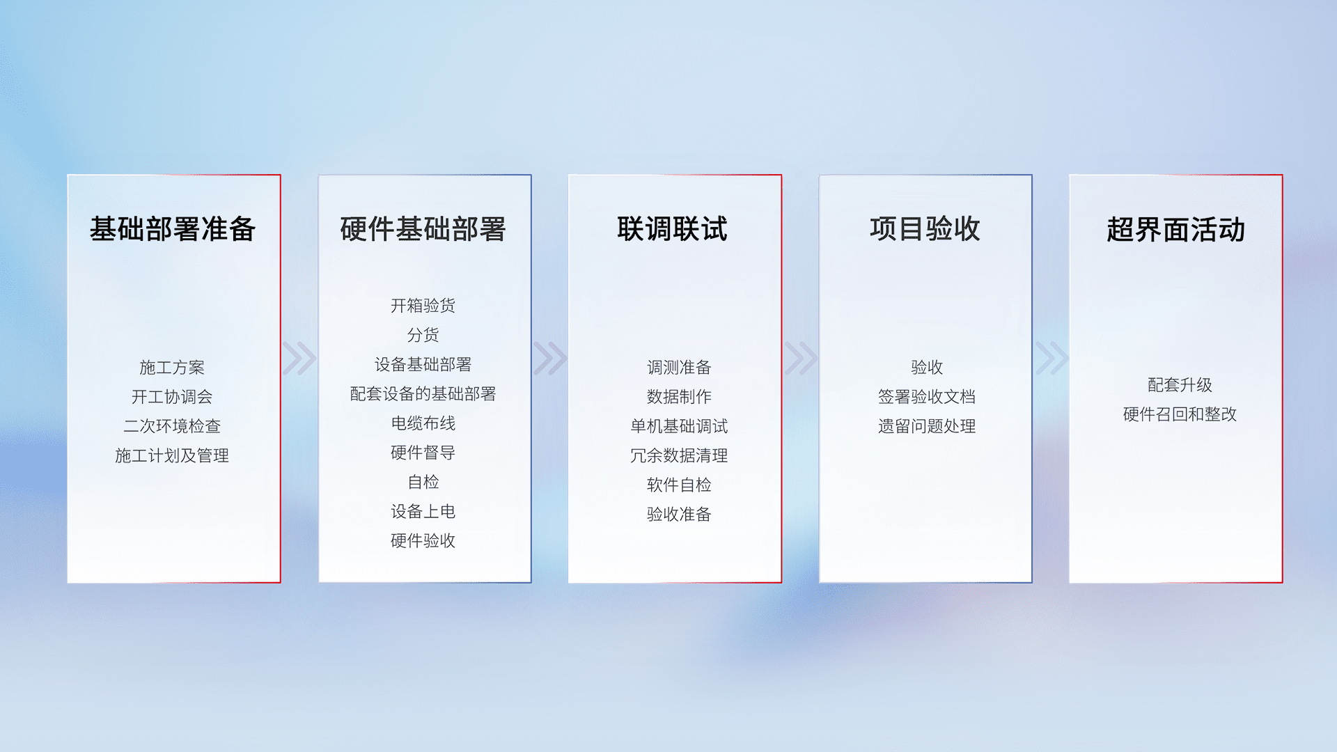 从基础部署准备、、硬件基础部署、、联调联试、、项目验收、、、越界面活动的全过程可追溯,,,,保证施工质量和进度。。。